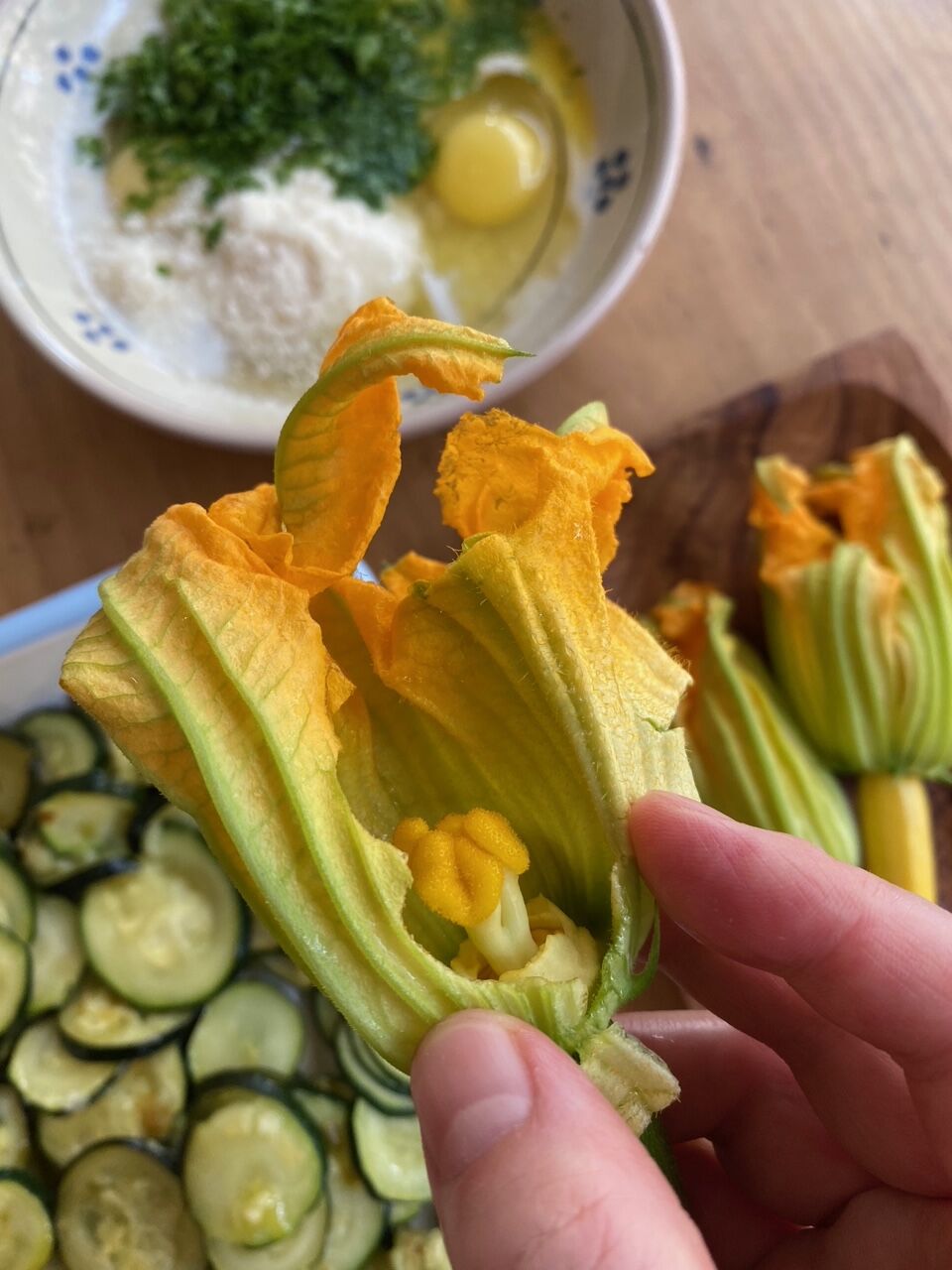 今回は雌花。めしべを取り除き、開きます。炒めた