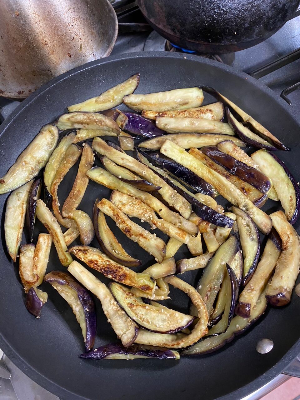 ナスは最初にオイルで炒めます。生のままトマト