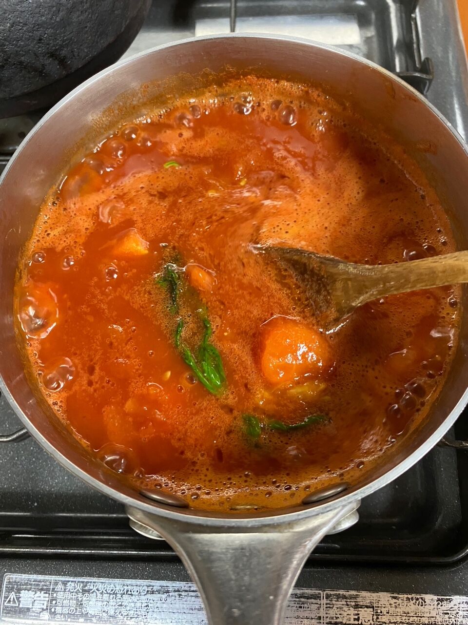 塩、バジルの葉を入れて煮詰めます。今日は