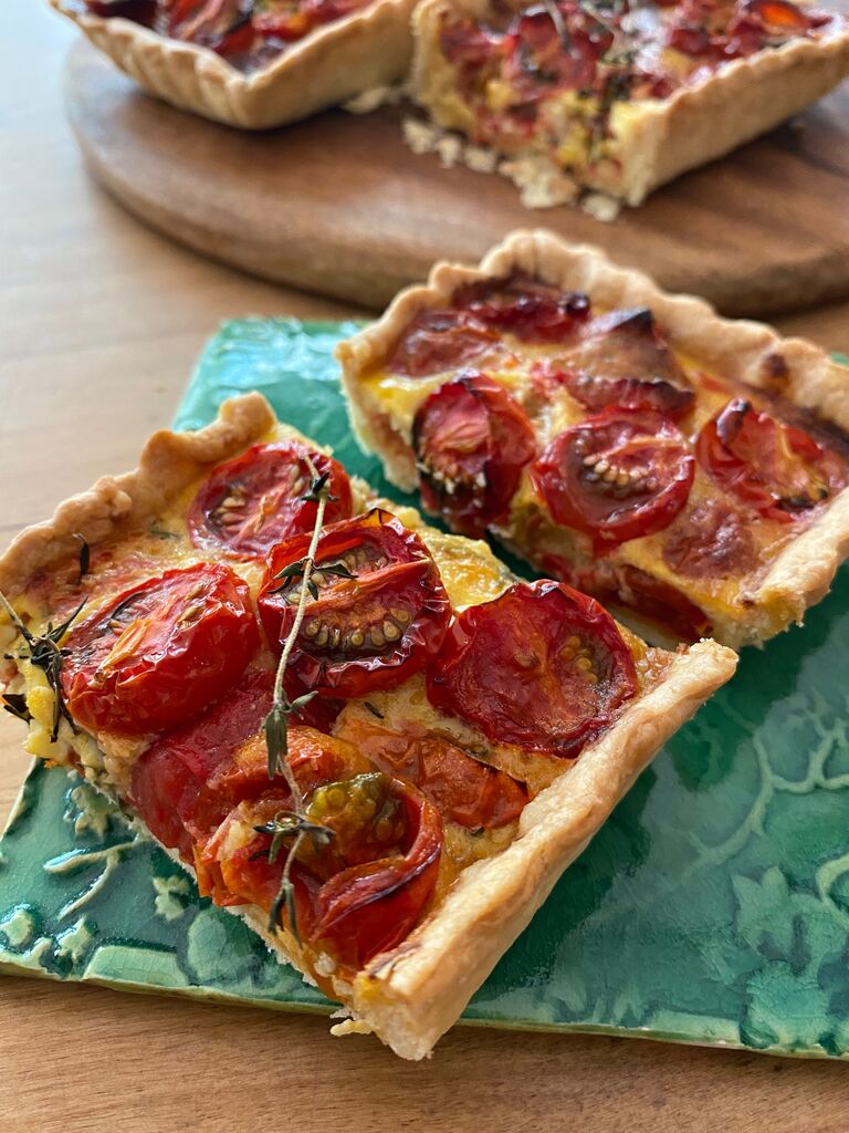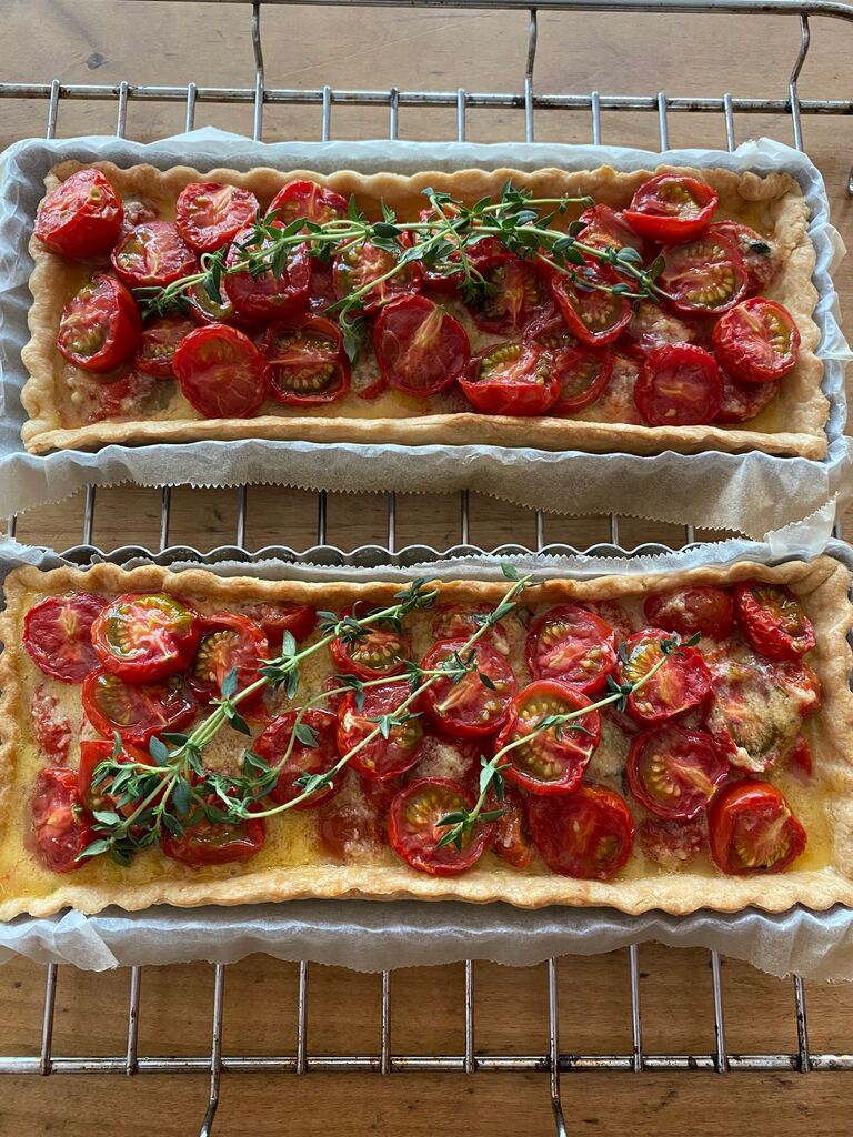空焼きして中身を入れ、飾りのトマトとタイムを