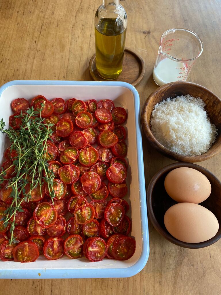 卵とチーズ、タイムの葉をよく混ぜ、トマトも入れて