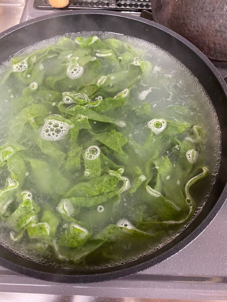 半乾きで茹でるとぬめりが出過ぎずよい具合に。