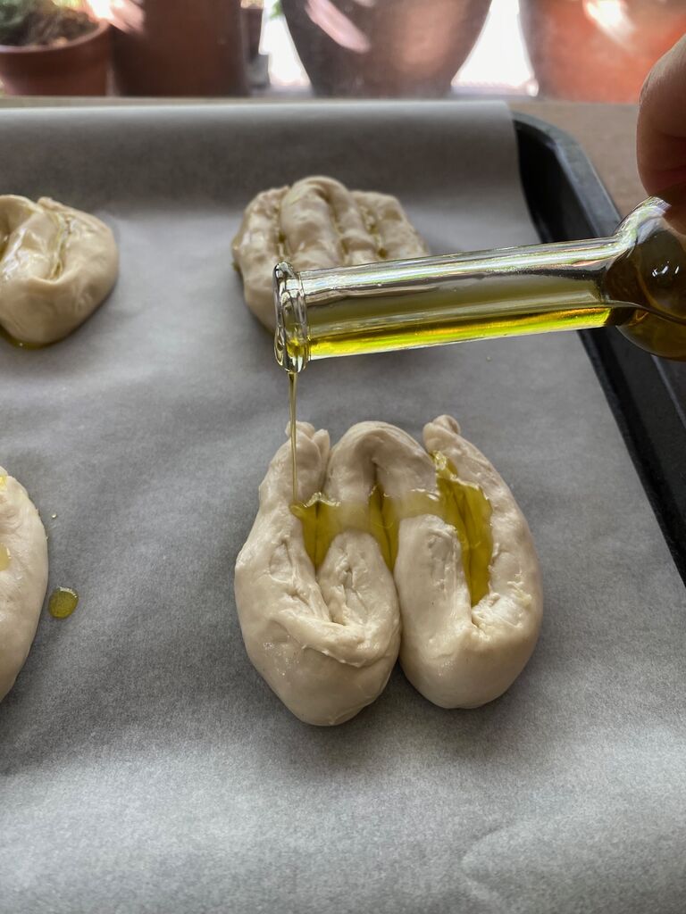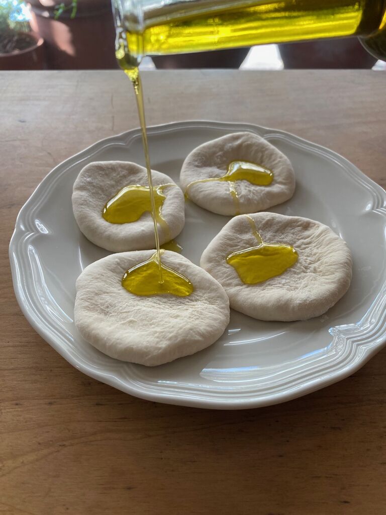 生地を少しのばしたら、写真のようにオリーブオイルをかけ、