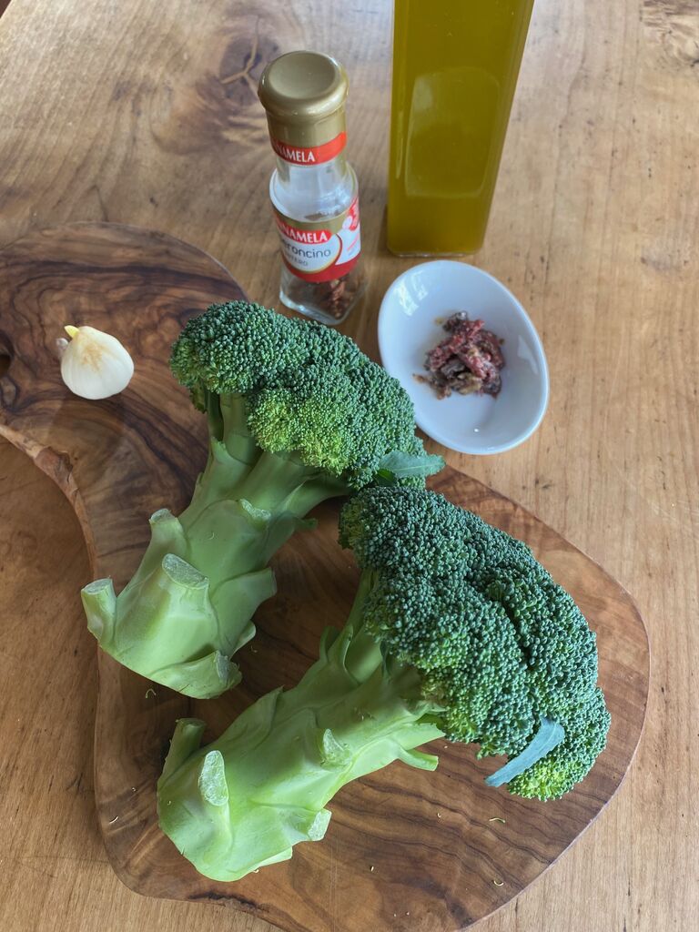 唐辛子、アンチョビを入れて軽く炒め、洗って切った