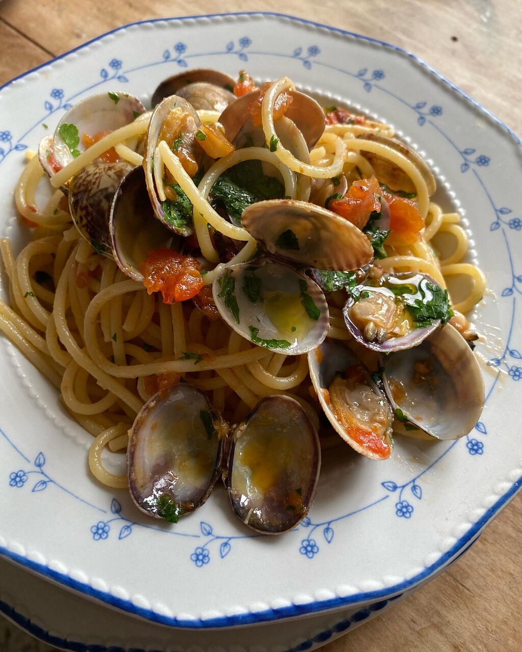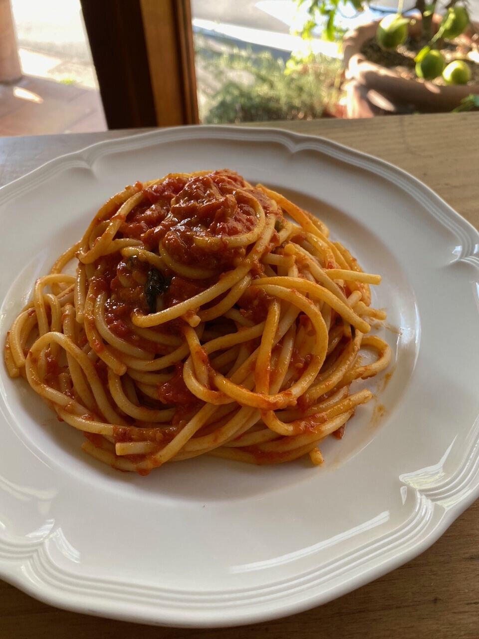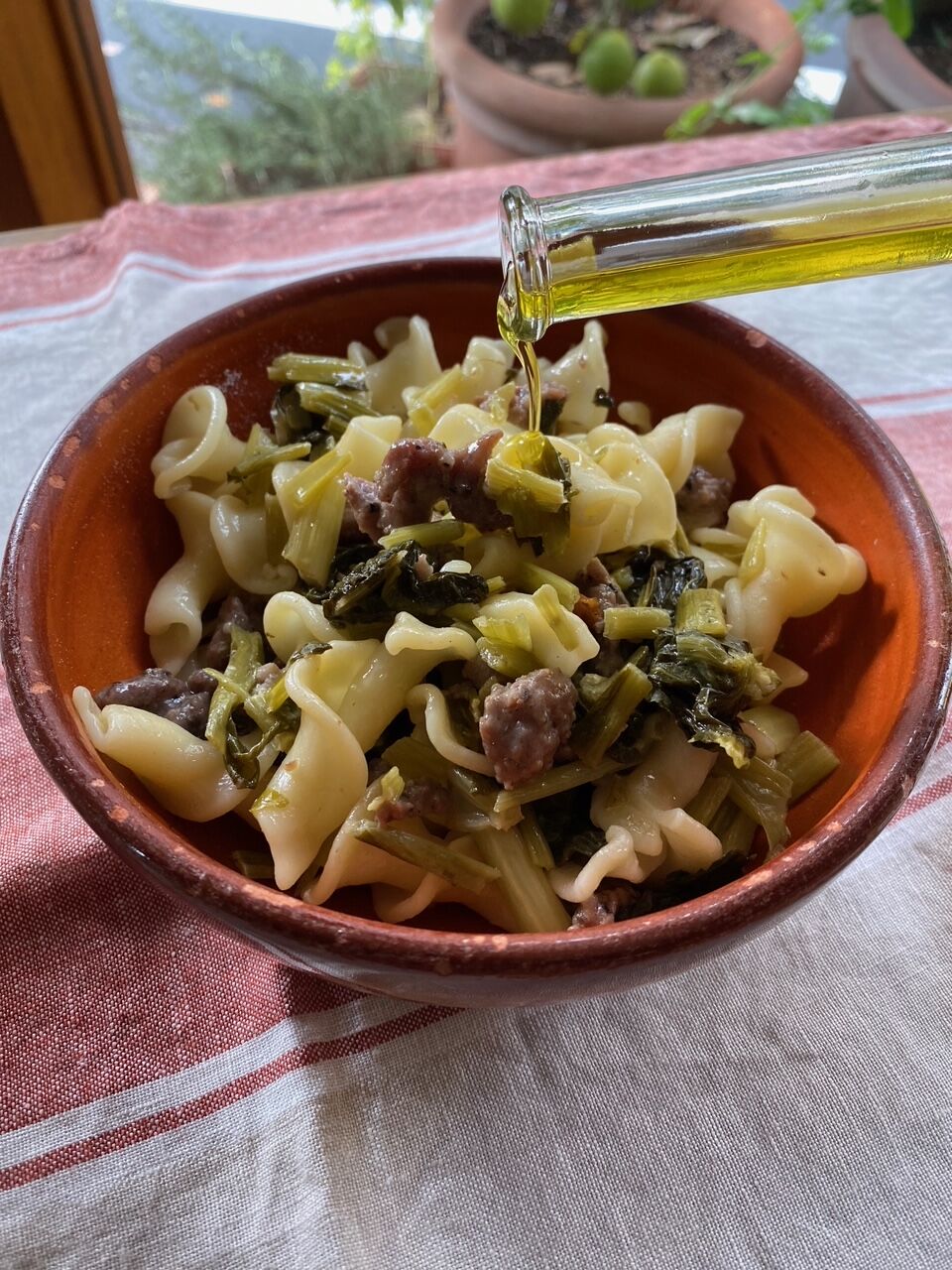 茹でたパスタを和えて最後に搾りたてのオリーブオイルを