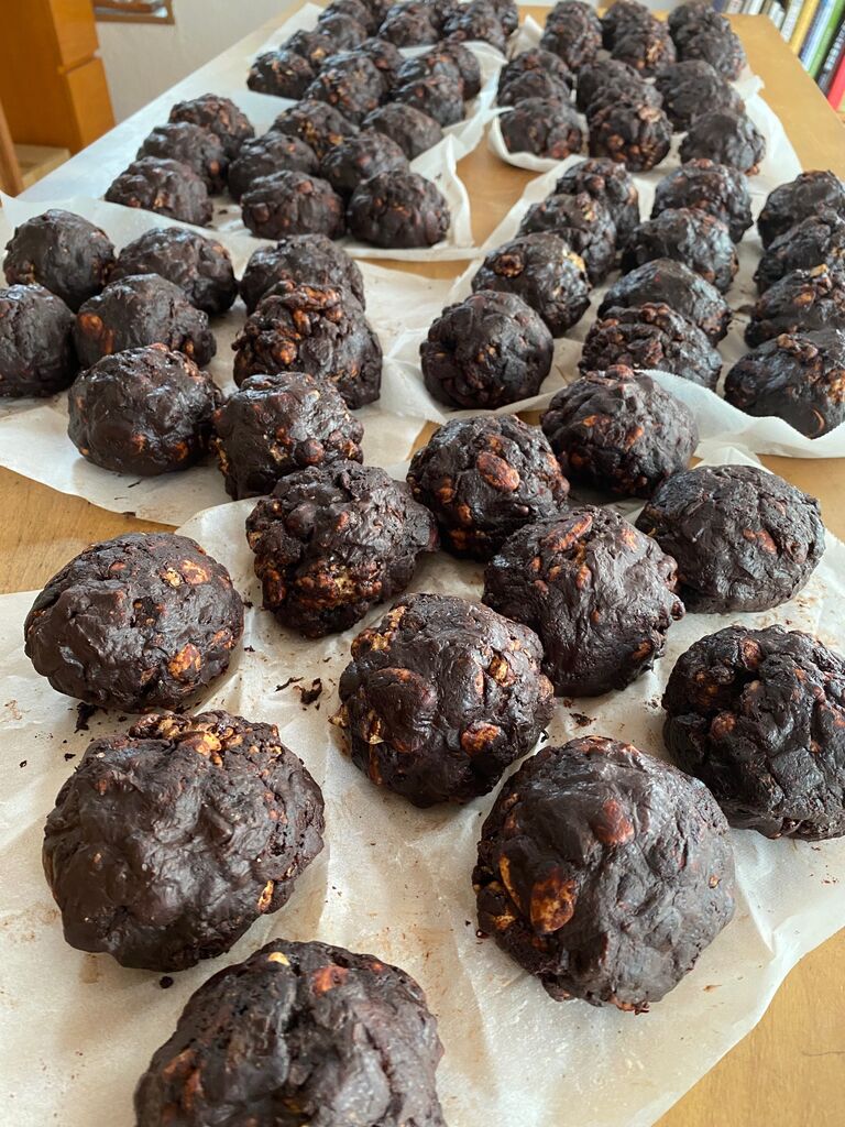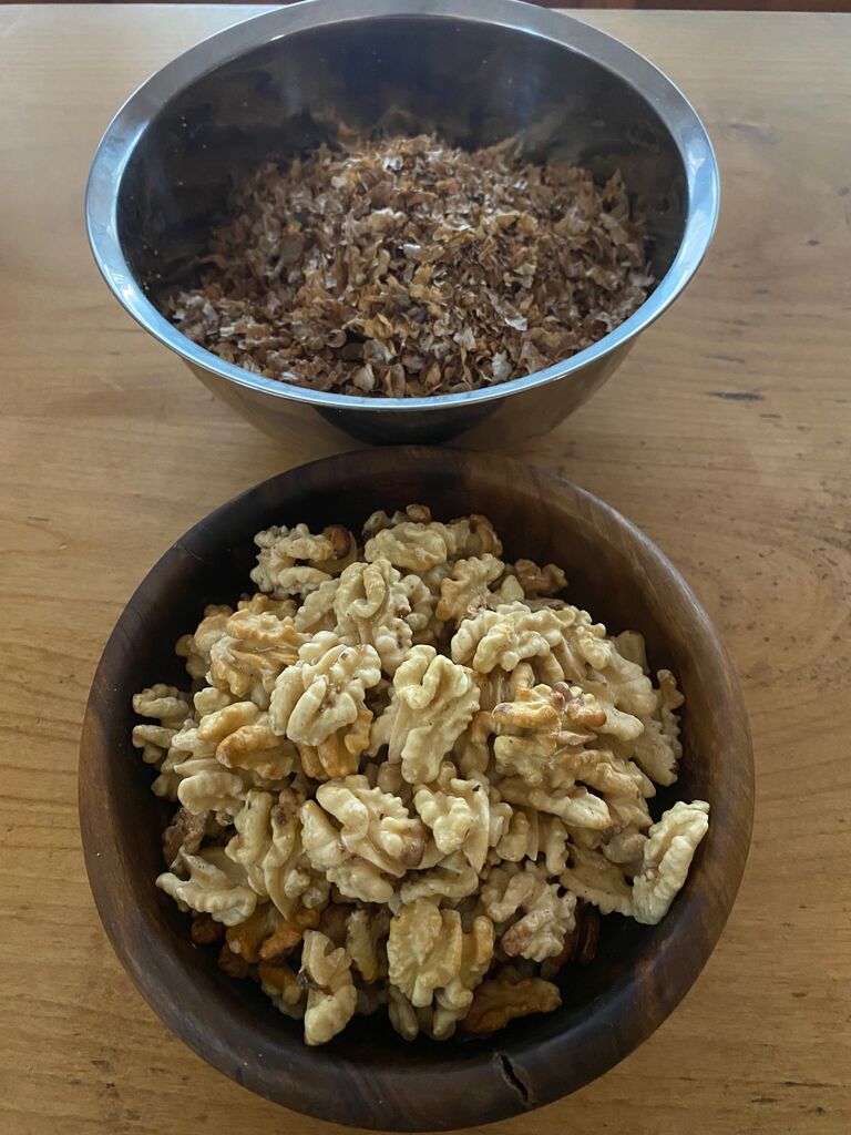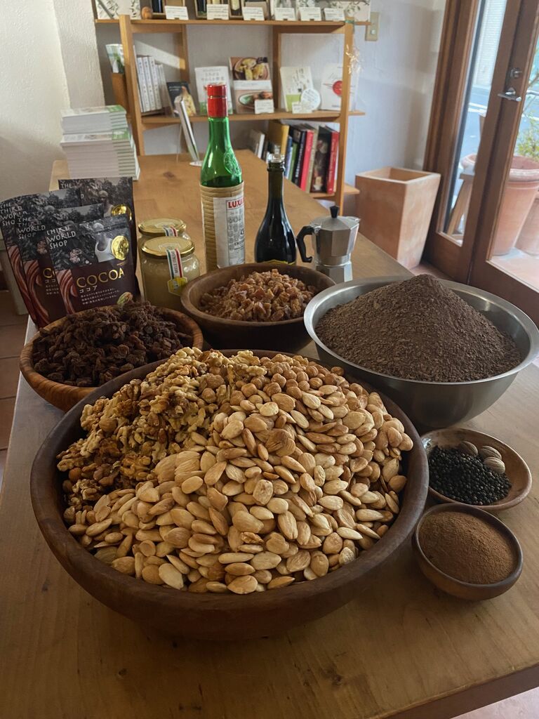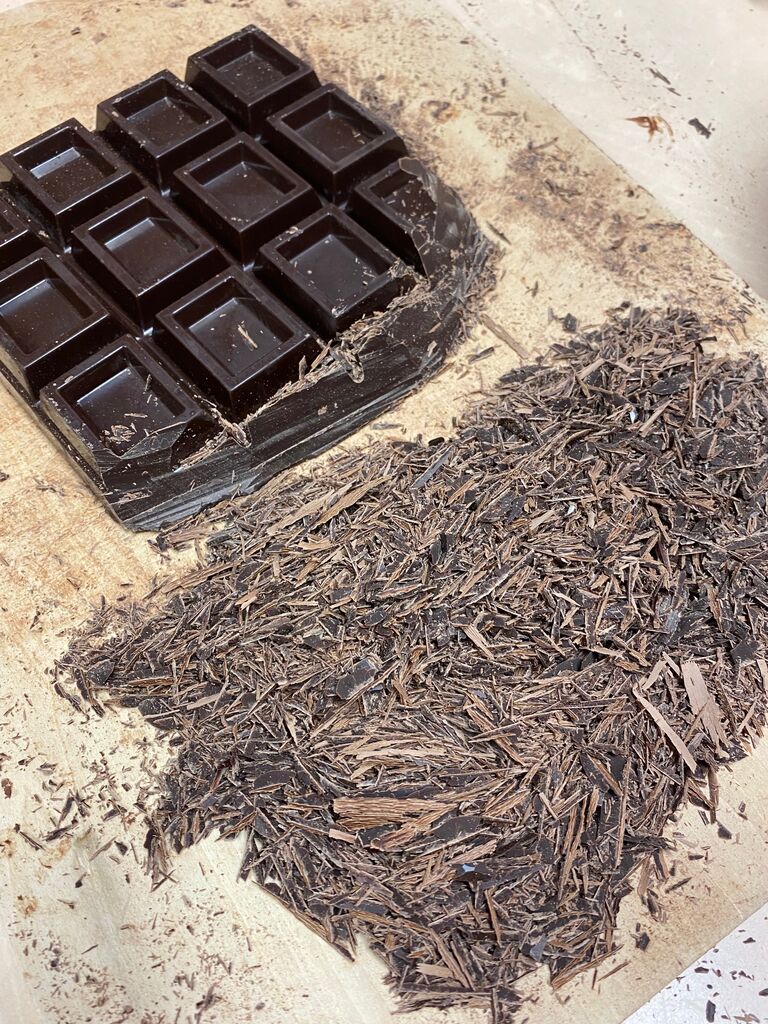 硬いチョコレートを5kg包丁で削り、くるみ3kgの薄皮を10時間かけて