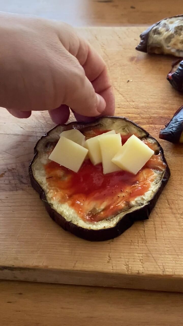 トマトピューレを塗ってチーズをのせ、軽く蓋をするようにナスを閉じます。