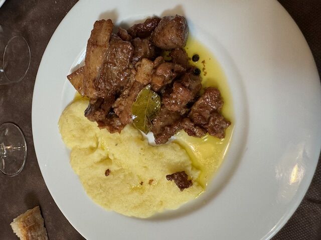 写真は行く途中のバスキで食べた豚肉の煮込みとマッシュポテト。ローカルな