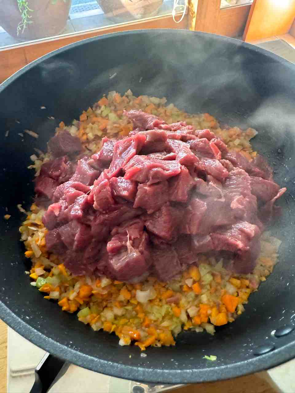 にんじんセロリ、玉ねぎを刻んでオリーブオイルで炒め、小さめに切った鹿肉を入れ、軽く炒めたら赤ワインを入れ、蓋をします。中火で煮ていると、しばらくして水分がたくさん出てきます。