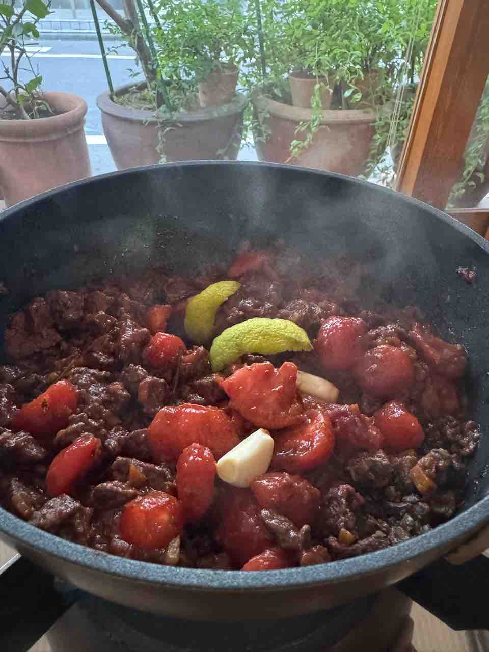 そこに皮を剥いたミニトマト、トマトピューレ、トマトペースト、にんにく、塩、レモンの皮を入れ、さらに沸々と1時間煮たら出来上がり!鹿肉は普段ジュニパーベリーを入れるけど、なかったので粒黒コショウでした。レモンの皮はポイントです。