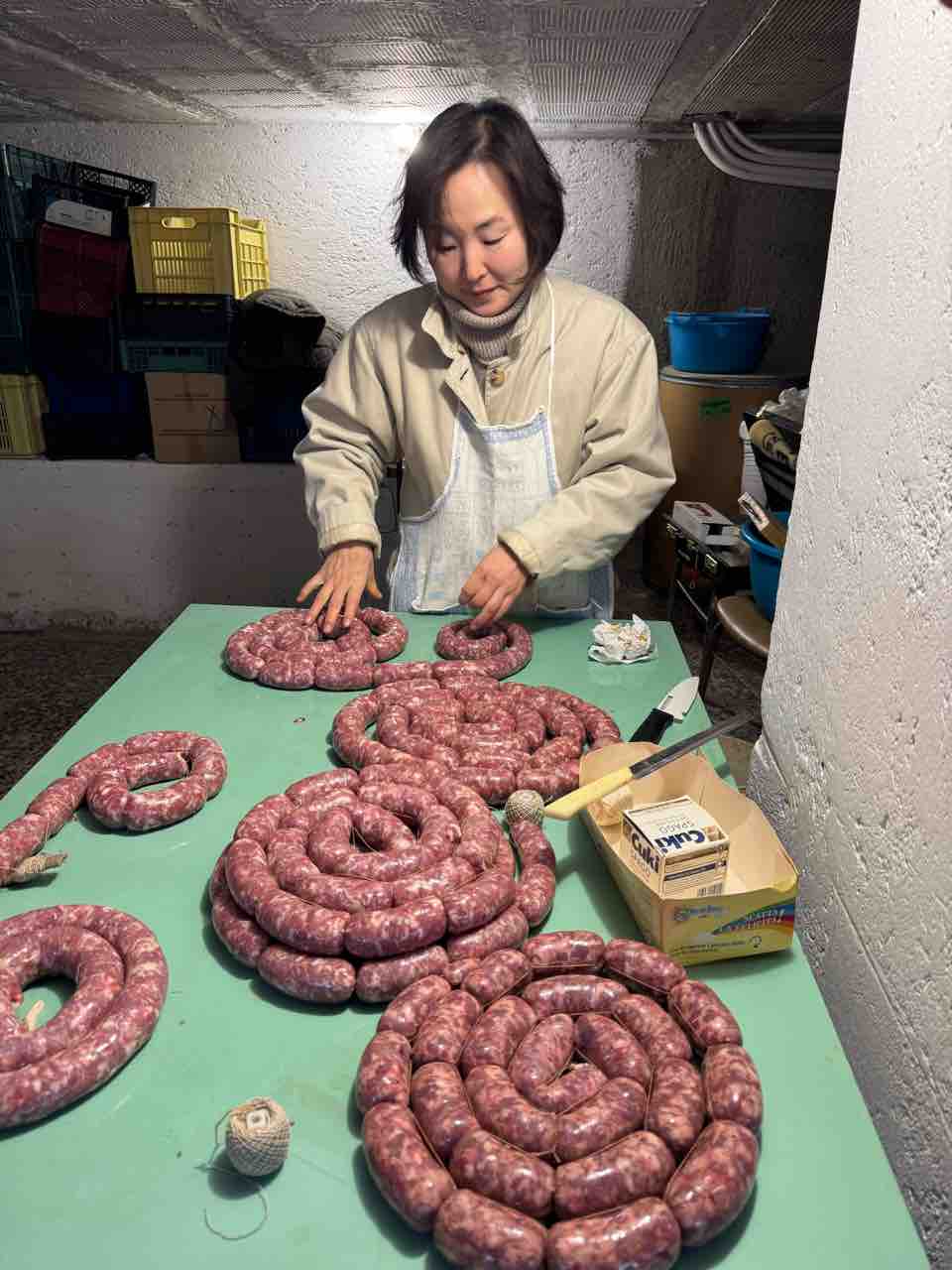 終わってからお昼をご馳走になりました。友人夫妻と娘2人、友人のお兄さんとお母さん、私とシルヴィオの8人で大きなテーブルを囲みます。サルシッチャのパスタの美味しかったことと言ったら。胸腺の炒め物には庭のレモンが入っていて、肉の旨みに爽やかなレモンの風味がたまりません。胸腺の脂は他の部位に比べて胃腸に負担の少ないすっきりした脂です。お皿に